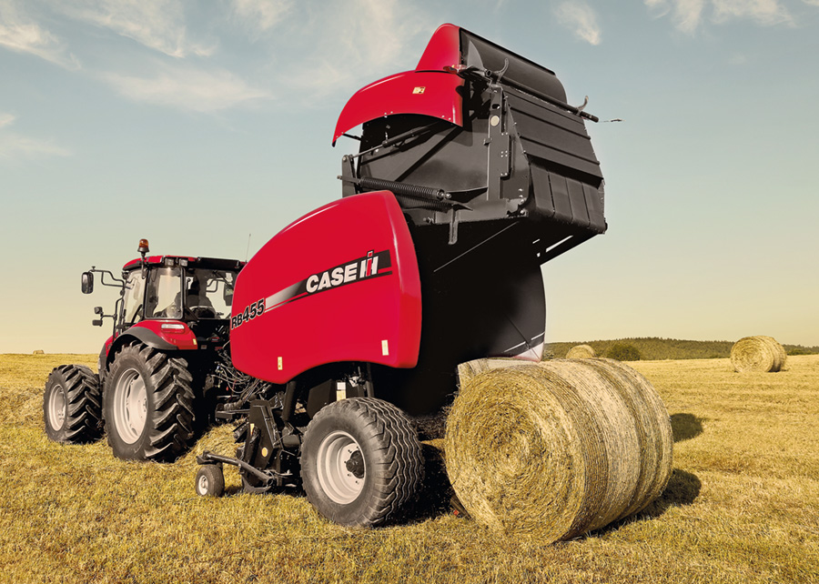Hitched to a Farmall tractor, here’s the Case IH RB455 VC working in hay: