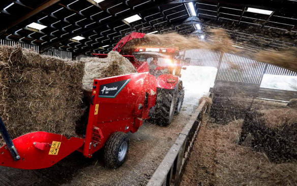 The adjustable regulating system with 3 preset positions is key to its flexibility.  For difficult foodstuffs such as long fibres and haylage bales, the low positioning of the boom prevents forage from getting into the turbine, ensuring fibres are effectively and evenly distributed.  And of course the quality of the straw is key so setting the tines to the raised position allows you to increase the flow of straw into the turbine with minimal flattening..  Maximum blowing distance – 18m.