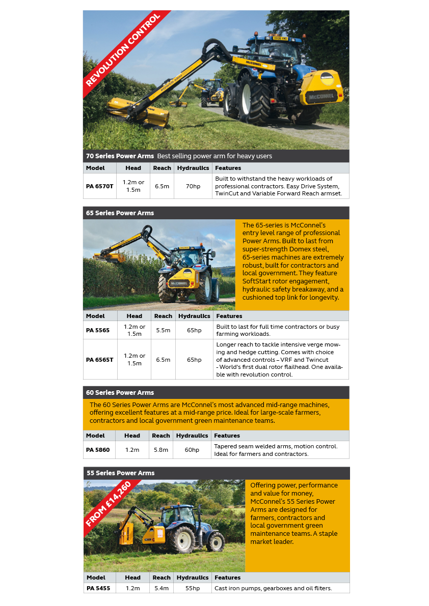 Following the spring sunshine in March and April, growth of hedgerows and verges has been early and rapid this year. In anticipation of a fast start to the cutting season we have made sure that our 2019 order of McConnel Power Arms is in stock and available to customers right now.