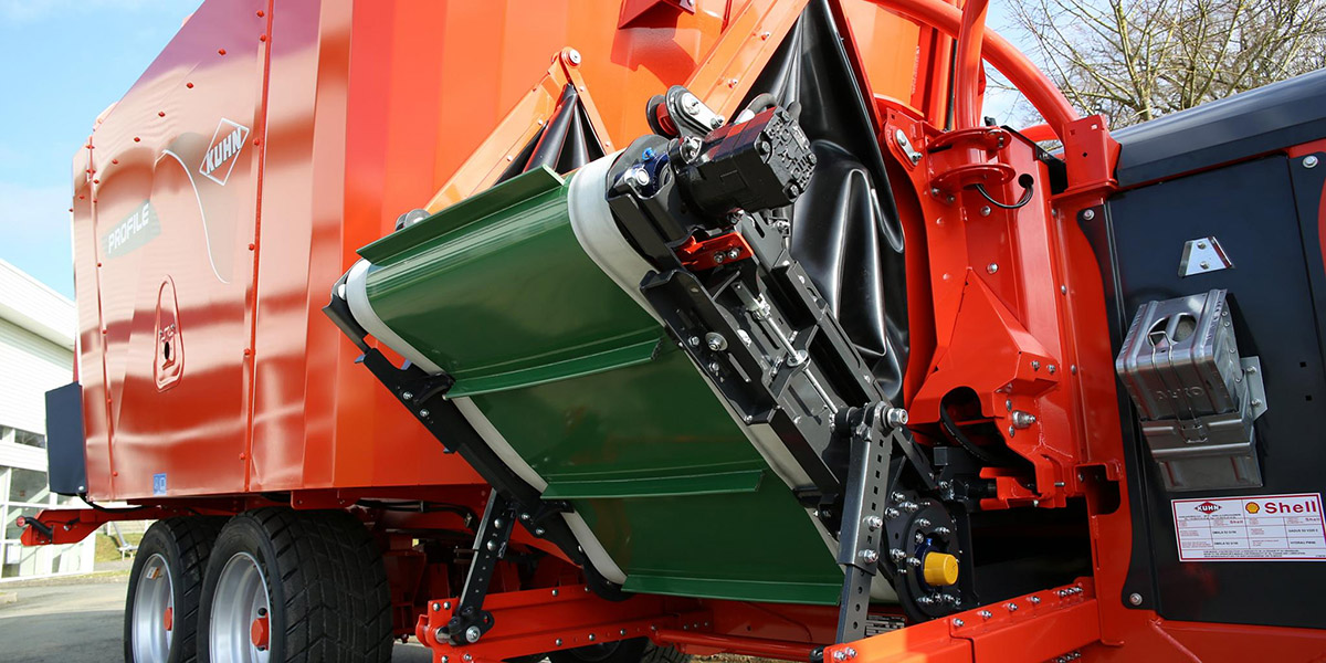 The patented FLEXILIFT conveyor is available as an alternative to a standard cross-conveyor on all new KUHN PROFILE mixer wagons and is designed to make it easier to distribute feed in buildings where space is limited: the reversible, cradle-shaped conveyor can be offset laterally via a telescoping mechanism to distribute feed to either side of the mixer wagon. One end of the conveyor (either left or right as determined when ordering the machine) can also be tilted by up to 45 degrees, enabling feed to be delivered to troughs up to 1.2 – 1.3 metres in height.