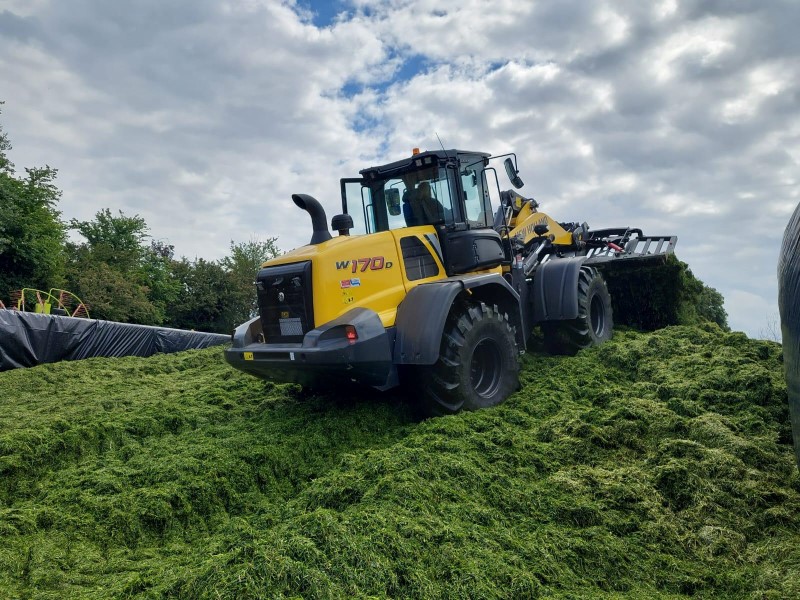 This W170D loader comes with Z bar linkage, a 195hp FPT engine known for reliability and a 5 speed powershift gear box with auto function giving speeds of up to 45kph.  The engine offers eco and max power modes helping boost performance on hills and when working with heavy loads.  Fitted with a 14ft Albutt folding grass fork this model has an operating weight of 14770kg and a tipping load of 12,640kg which feels more than enough for most applications.