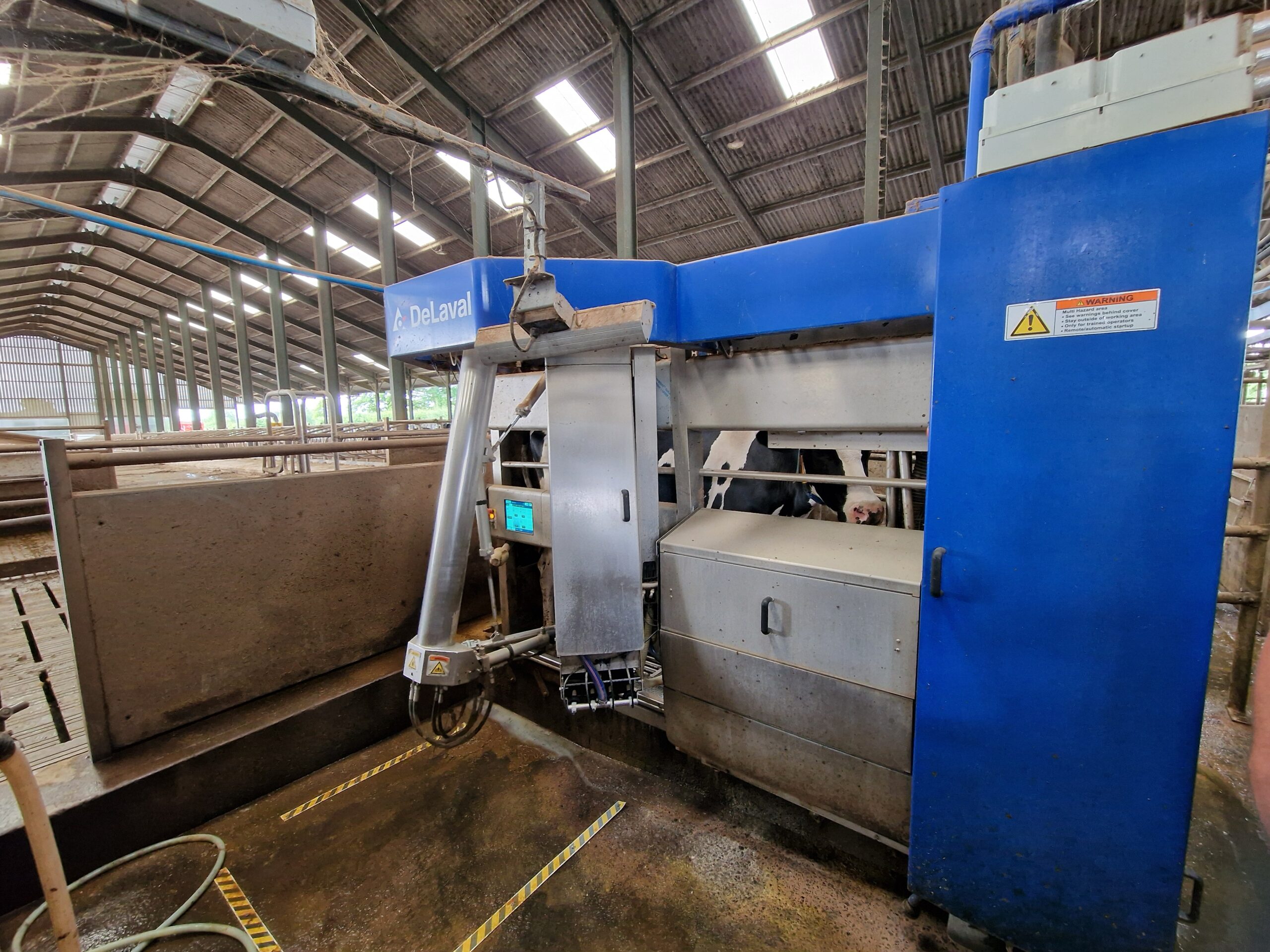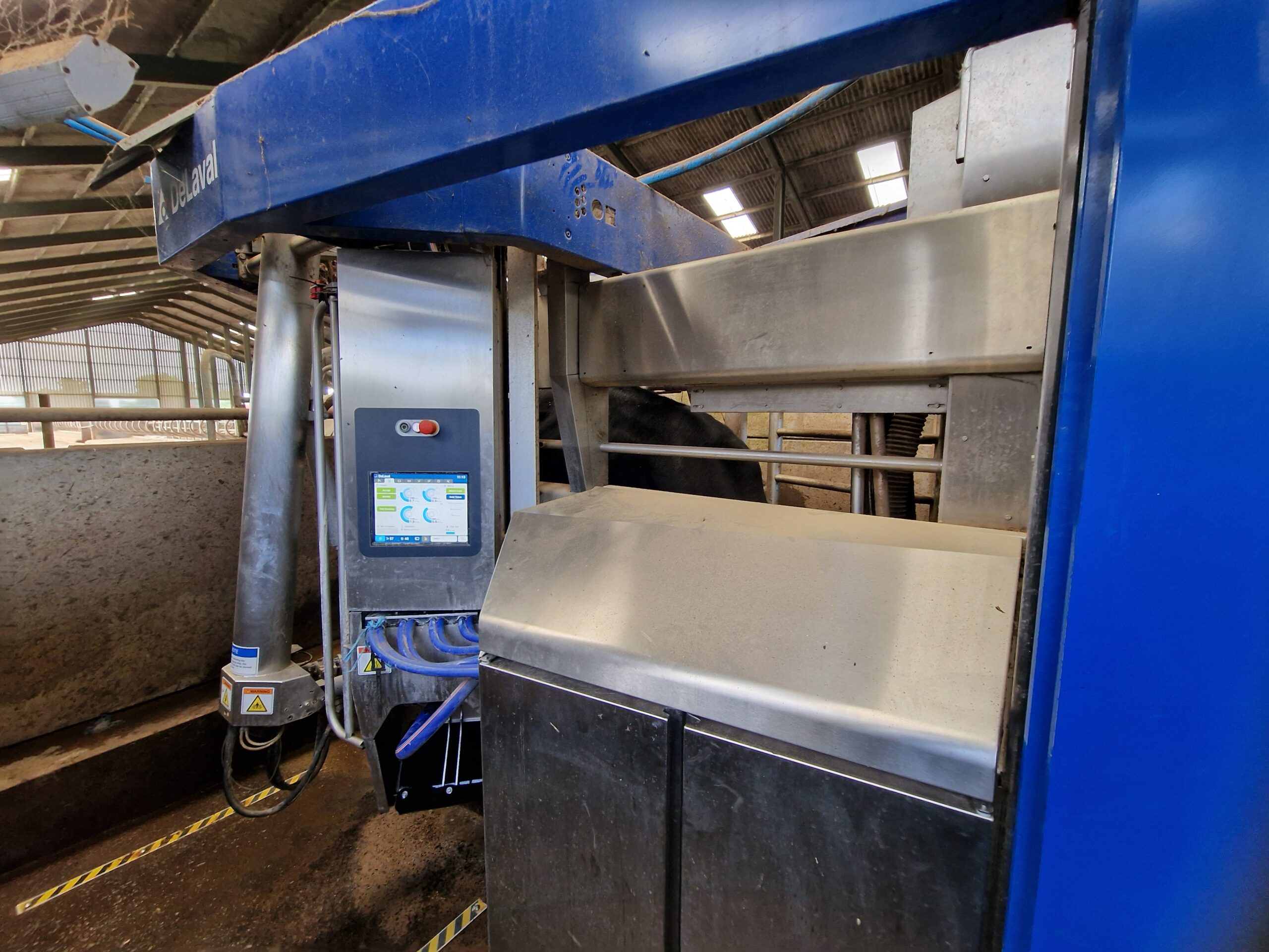Mr Grey has two DeLaval Classic robots and one newer VMS V300 model. The difference in the technology is significant, with the cows preferring the newer model and giving more milk when milked by it.