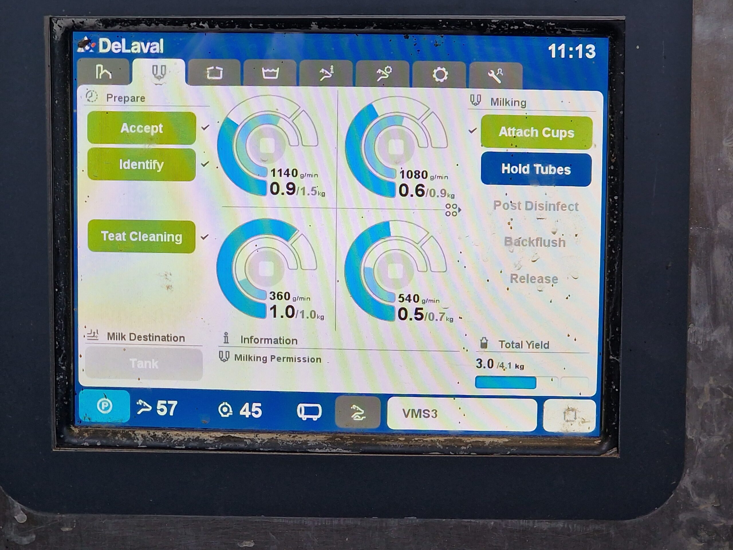 “The V300 has better attachment so we use it predominately for cows with teat positions that are trickier for the other two to handle. It is quicker to milk too, on average it takes 5 minutes 35 seconds compared to 6 minutes with the older model. This, and the faster cleaning time of the new model, enables it to average 172 milkings per day compared to 130,” he says.