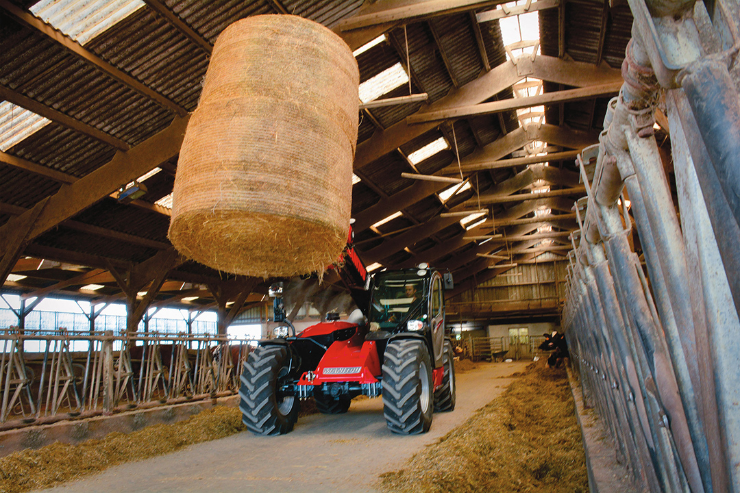 Manitou MLT737 telehandler driving through a cow shed with a raised hay bale