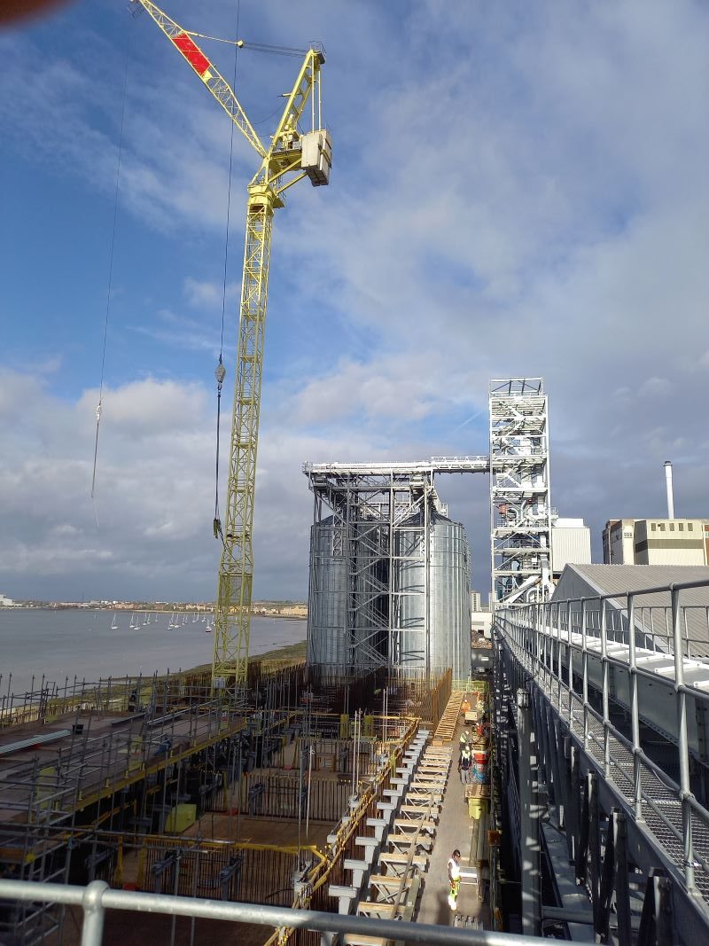 All the fabricated hot dip galvanised steelwork on the contract has been structurally designed and manufactured by T H WHITE Projects and installed using Graph Engineering equipment.  This controls ensured optimal quality, on-time delivery and maintained accuracy for on-site alignment,  The steelwork arrangement includes a short transfer tower near the Grain Terminal centre house and a very tall tower near to Silo 3 which is connected by a double deck gantry conveying structure with trestles to ground across approximately 100m.  The double deck gantries are contained within an extremely tight footprint running alongside Silo 4 and the adjacent bulk flat storage facility with additional low- and high-level transitions at either end into the centre house & Silo 3 respectively.