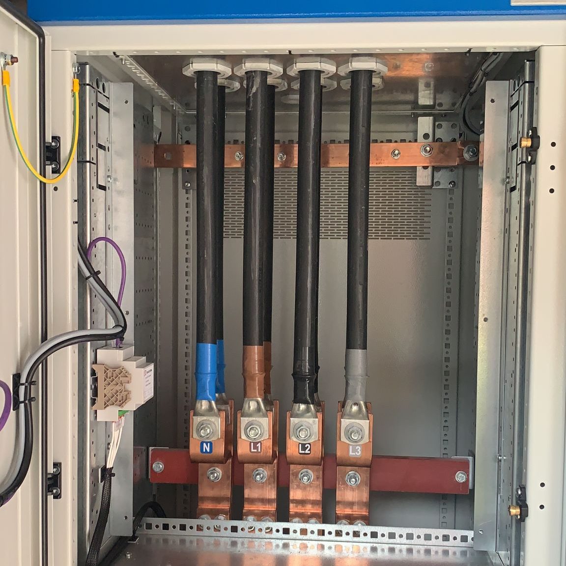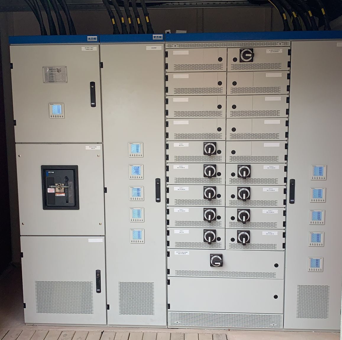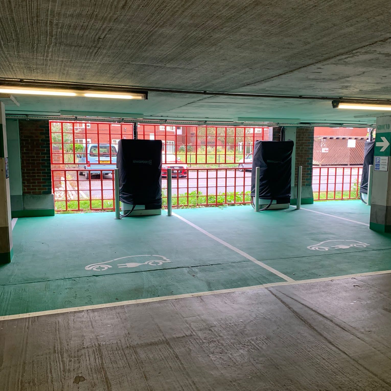 Our team installed 6 rapid 50kW electric chargers, and 3 fast 22kW chargers plus new LED lighting in each bay. They built an external GRP enclosure to house the new 1600amp Eaton panel board with a reinforced concrete base and ran approximately 800m of cabling and containment fixed to the car park ceiling to power both the chargers and to maintain existing site demand. Each charging bay was finished with fabricated steel bases, allowing cable entry from below. All works were undertaken while the car park remained open, so the team worked alongside redirected traffic flows and continued throughout the night in those ‘hard to access’ areas during operational hours.