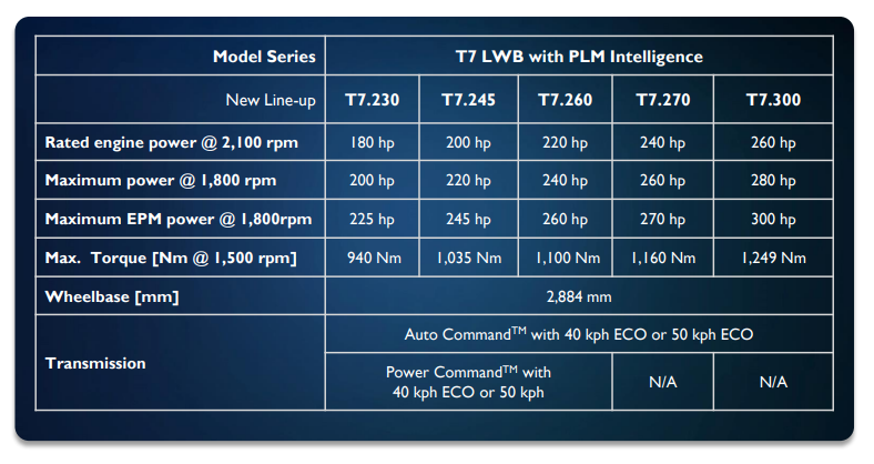 The power line up for the new LWB is the same as the current Stage V range (from T.230 – T7.270) with the addition of the new flagship T7.300 Auto Command offering rated power of 280hp and maximum boosted power of 300hp.